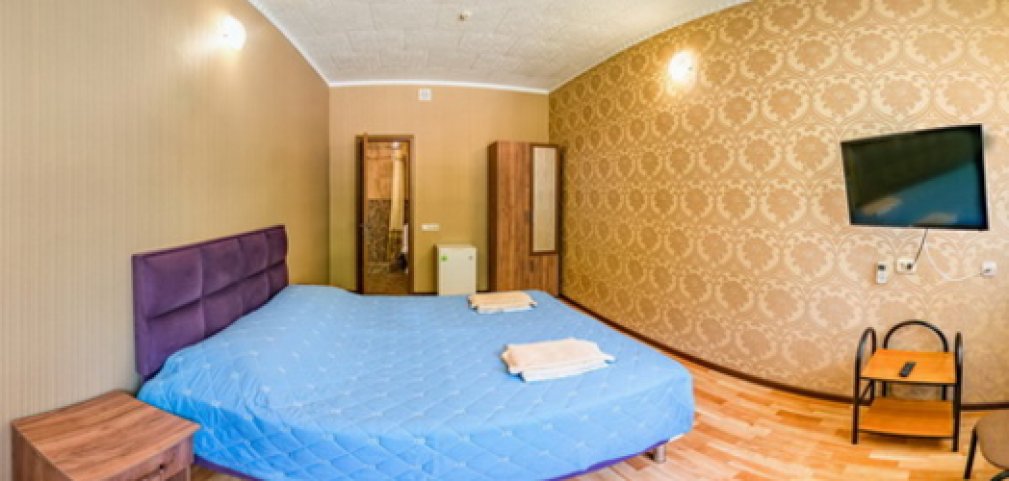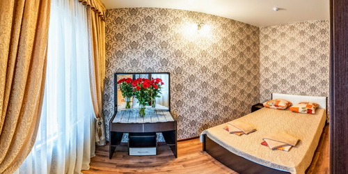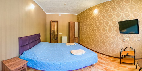 4-местный 2-комнатный люкс (по запросу) - санузел с душем, телевизор, холодильник, кондиционер, журнальный столик, шкаф с большим зеркалом, двуспальная кровать в спальной комнате, две раздельные кровати или мягкая мебель во второй комнате.